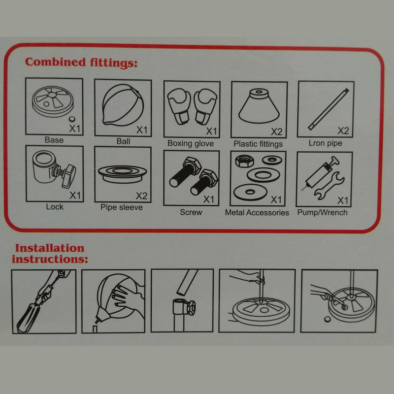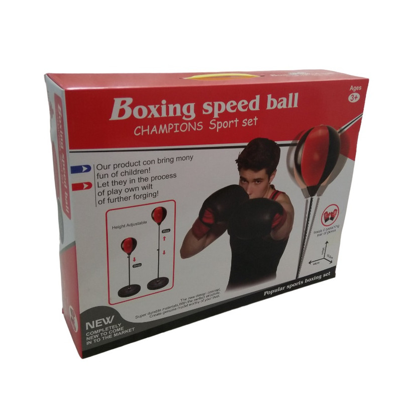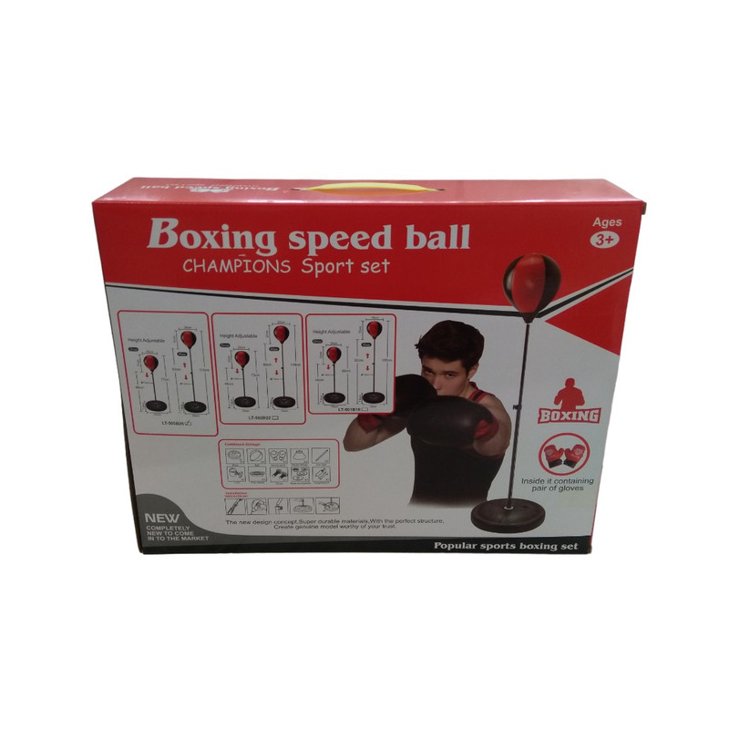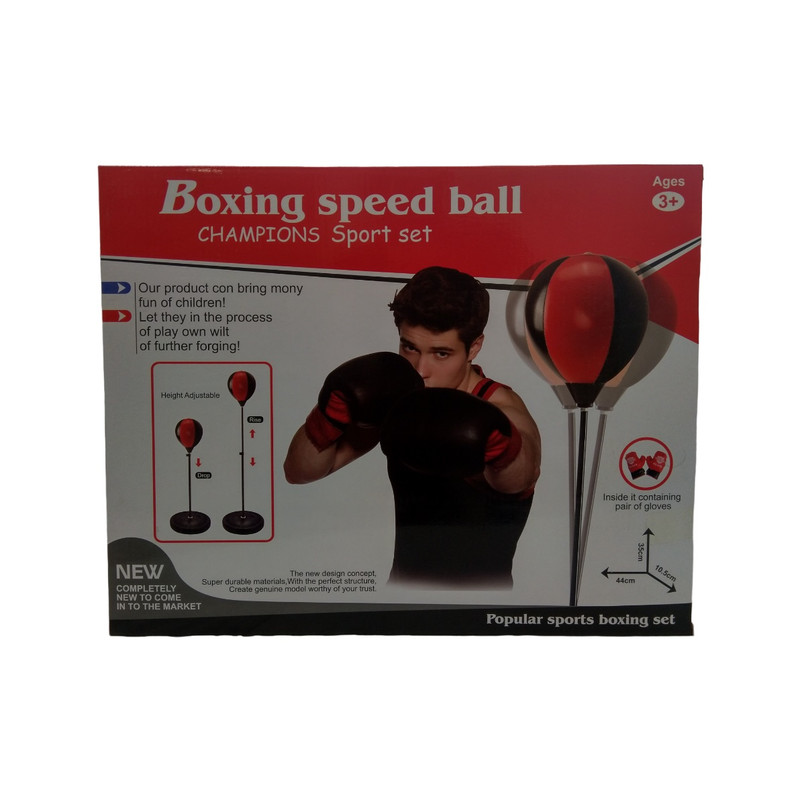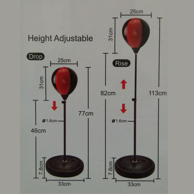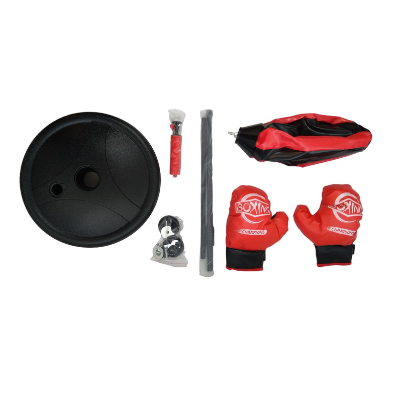 کیسه بوکس کودک به همراه یک جفت دستکش بوکس دارای پایه فلزی که ارتفاع آن از 77 تا 113 سانتیمتر قابل تنظیم میباشد . برای سنگین شدن پایه باید آنرا با آب و یا ماسه یا خاک پر نمود . دارای کیفیت مرغوب ساخت کشور چین .