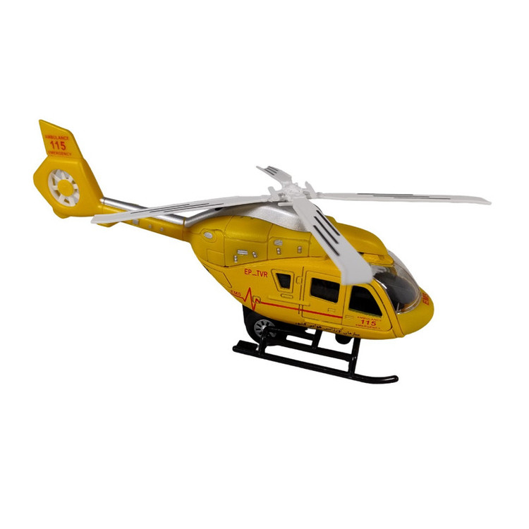 سایر توضیحات : هلیکوپتر اورژانس به طول 22 سانتیمتر عقب کش همراه با چرخش ملخ . با فشردن کلید روی هلیکوپتر چراغ داخل آن روشن شده همراه با جلوه صوتی . دارای دو درب بازشو . ساخت ایران . این محصول فاقد بسته بندی تکی شرکتی است و در بسته بندی پلاستیک حبابدار تقدیم میشود .
